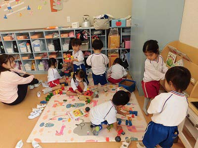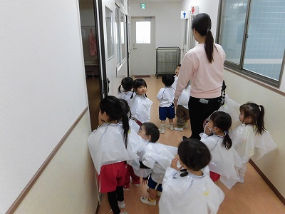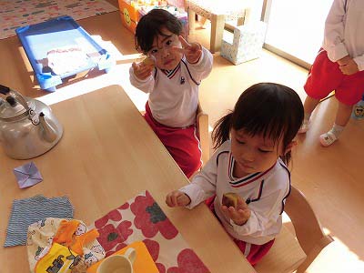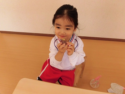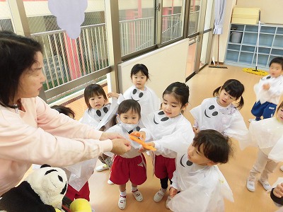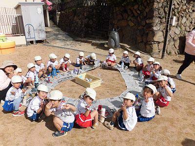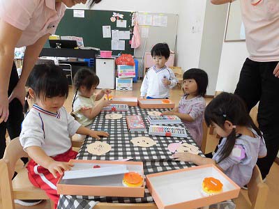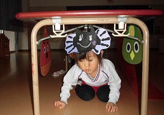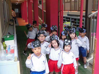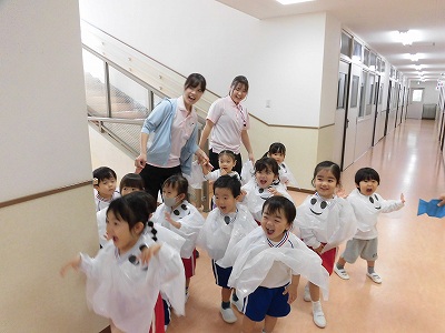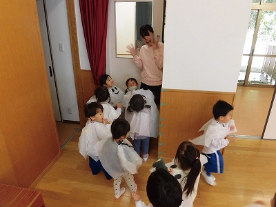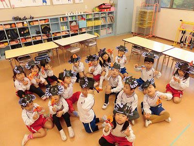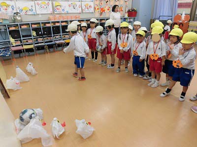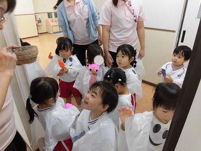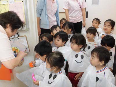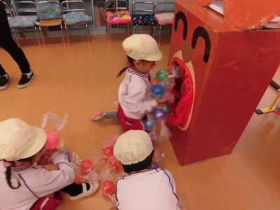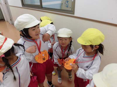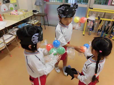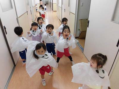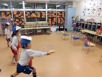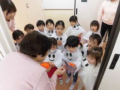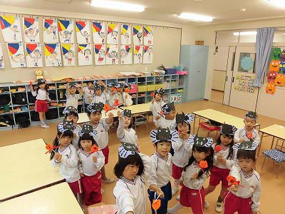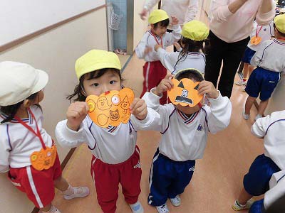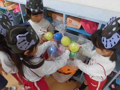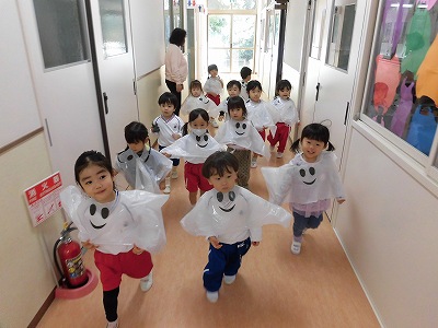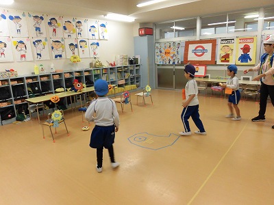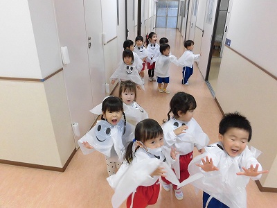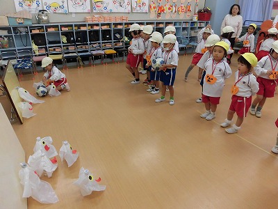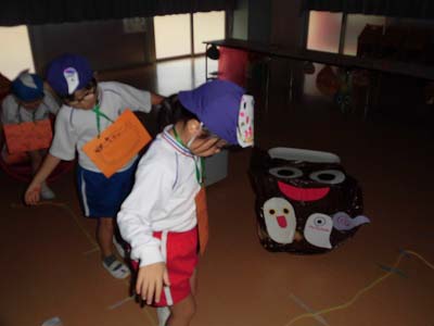 今日はハロウィンのお楽しみも行いました!手作りおばけを帽子につけ、各お楽しみスポットを回ります。