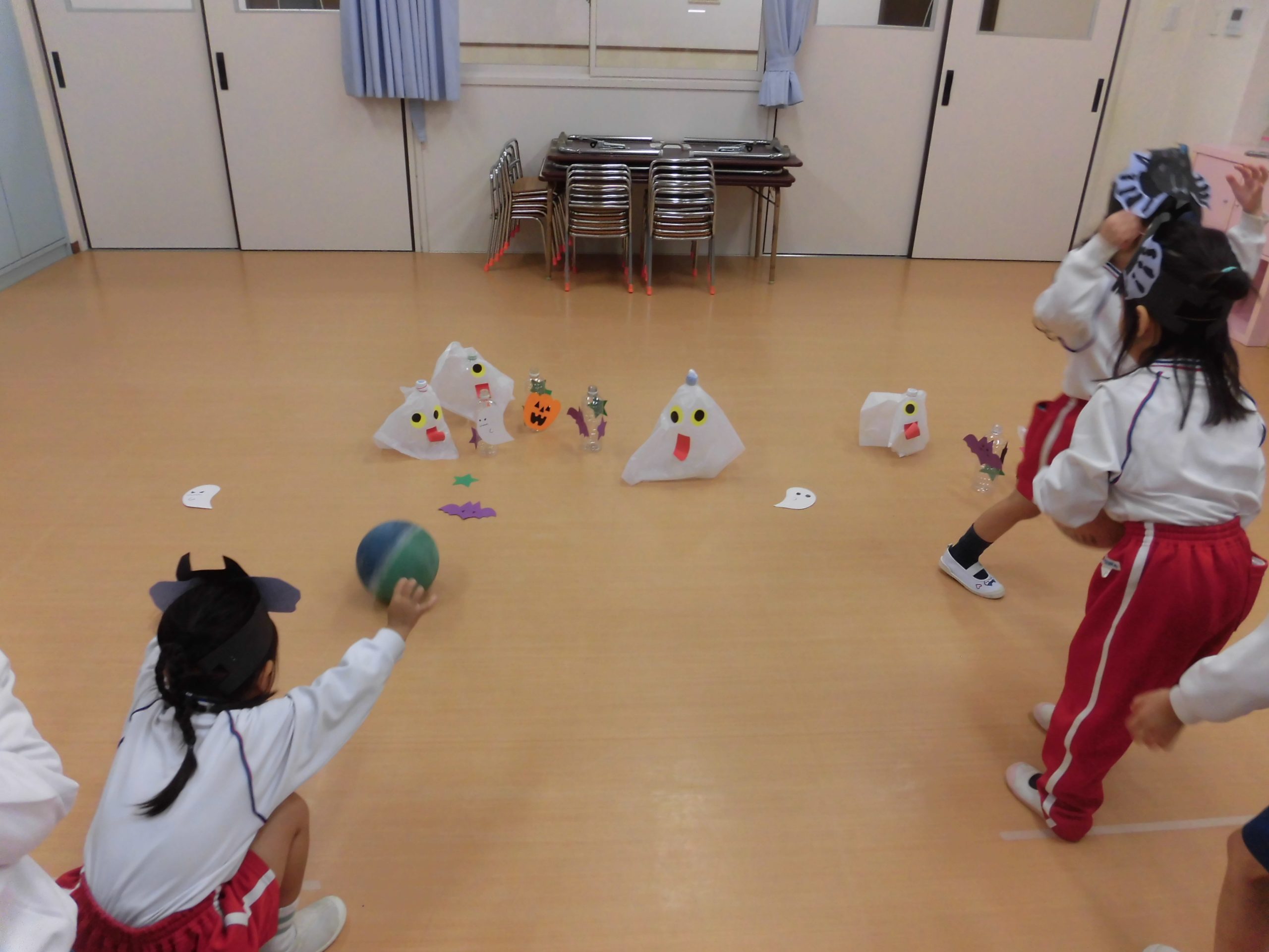 「おばけやしき」・「たおせ!おばけ!ゲーム」・「かぼちゃつみあげゲーム」・「おばけすべり」などいろんなお楽しみを回って大盛り上がりの子どもたちでした♪