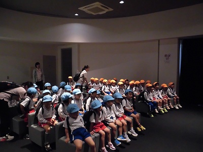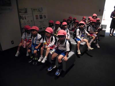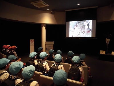 建物の中へ。まずは映像でグリコの歴史やチョコレートのことを学びます。