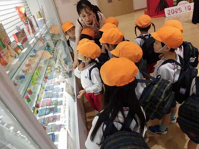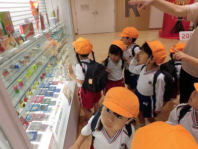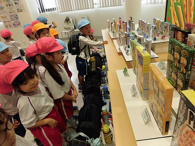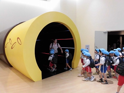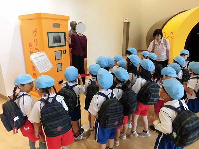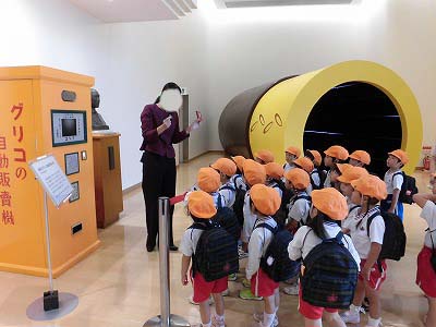 クラスごとにスタッフさんが工場内を案内してくださいました。ポッキートンネルや昔のグリコ自動販売機などに興味津々!