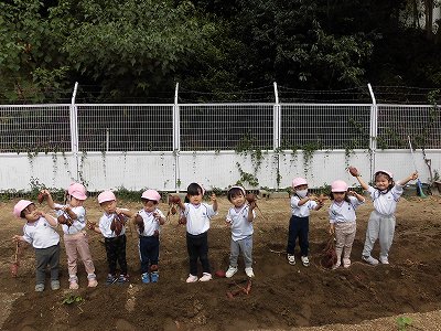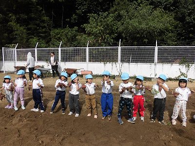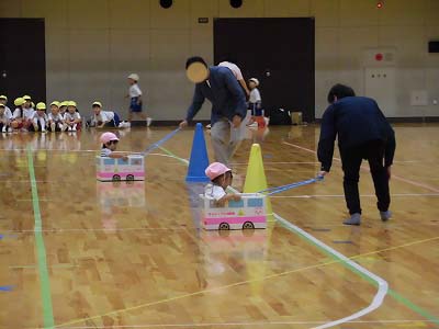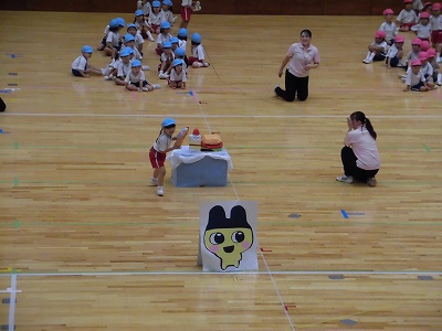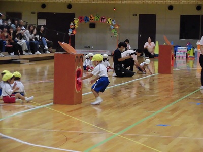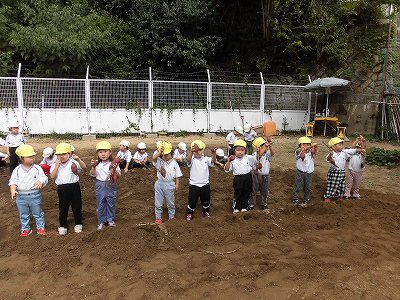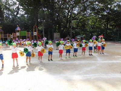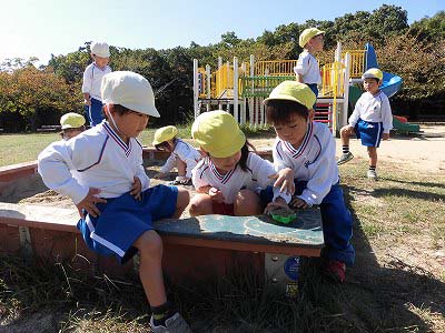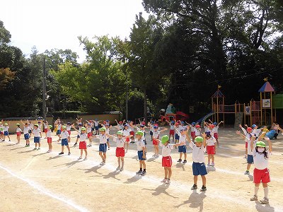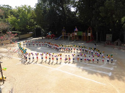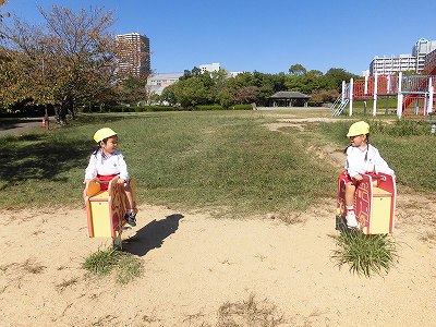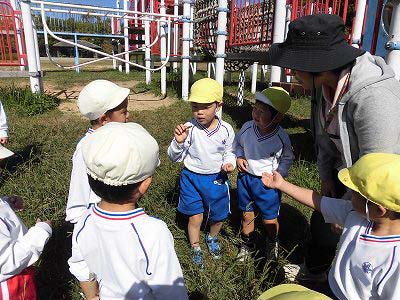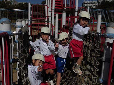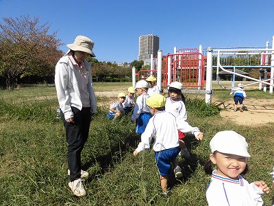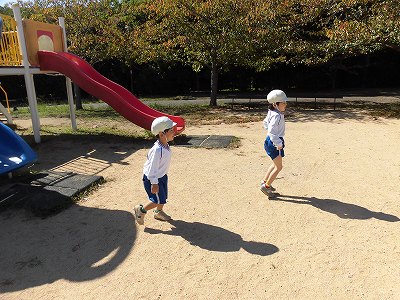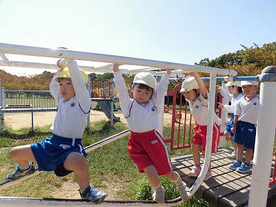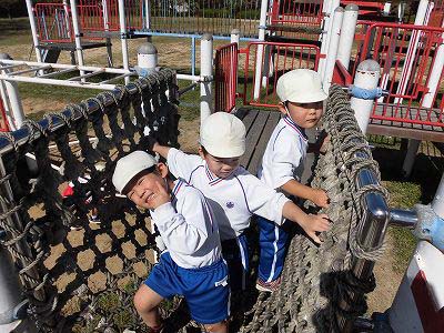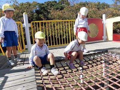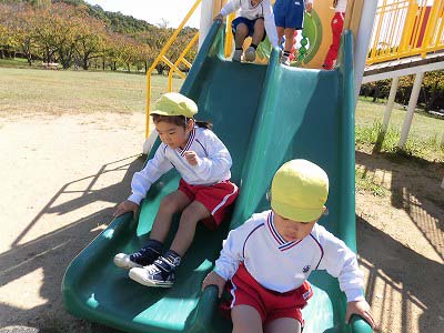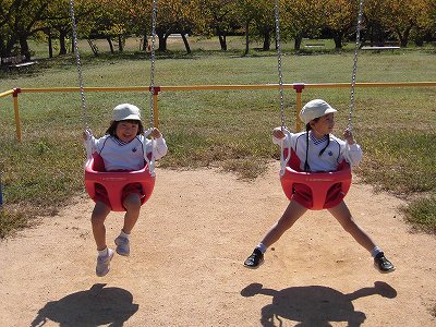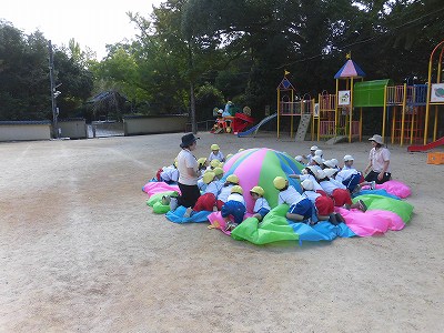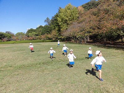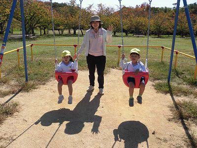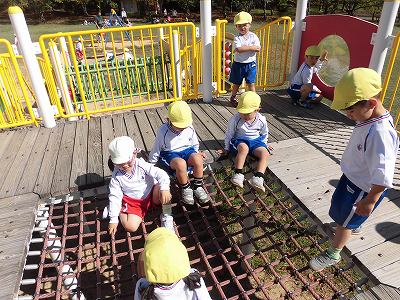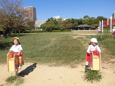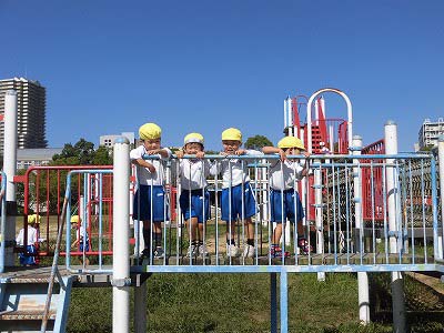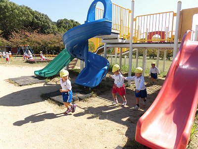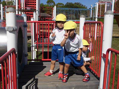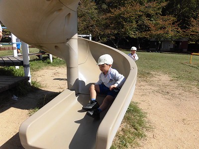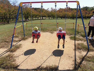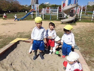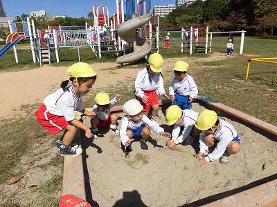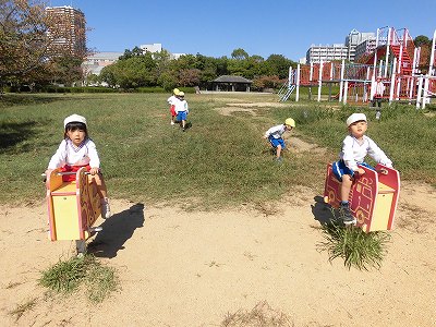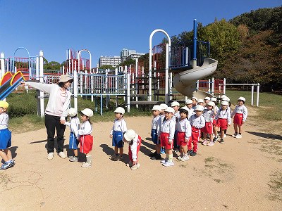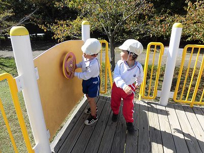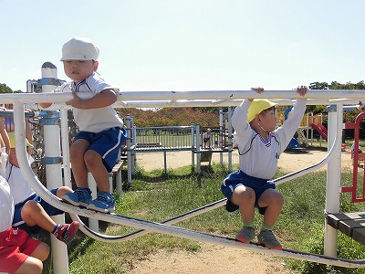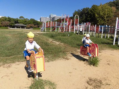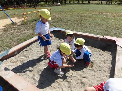 「いってらっしゃい!」と先生が言うと「いってきまーす!!!」とお目当ての遊具に向かって走っていく子どもたち。総合遊具、ブランコ、砂場などでたーくさん遊びました♪