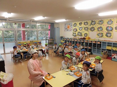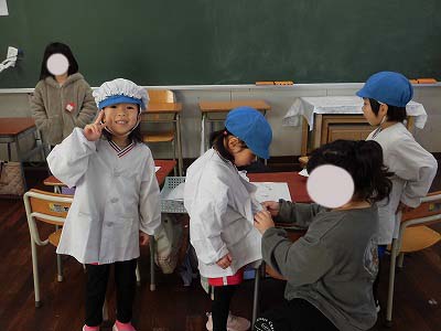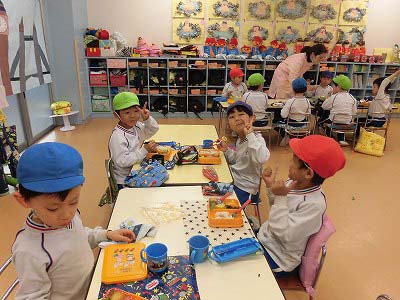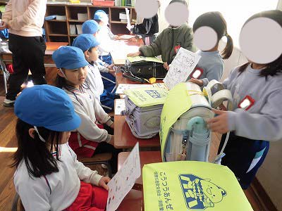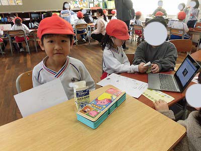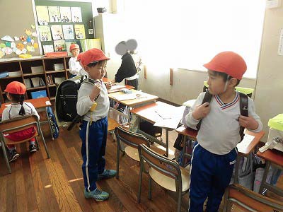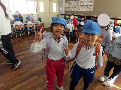 1年生の教室に招いてもらい、お兄さん・お姉さんから小学校ではどんなことをするのかタブレットを使って教えてもらったり、ランドセルを背負わせてもらったり、給食当番やお掃除があることを教えてもらったり…様々な体験をさせてもらいました!!