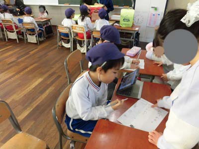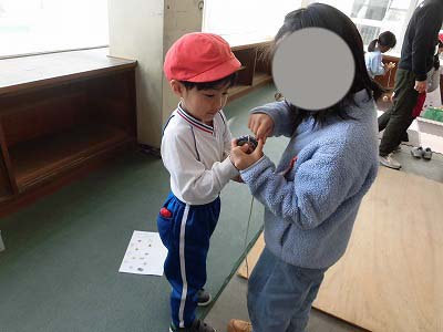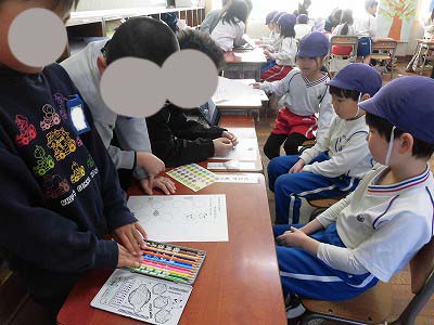 1年生が鉛筆を貸してくれて名前を書くお手伝いをしてくれたり、算数セットをさわらせてくれたりもしました。年長さん、興味津々です!