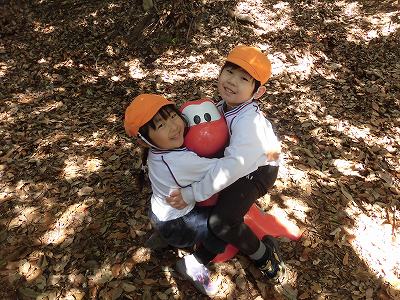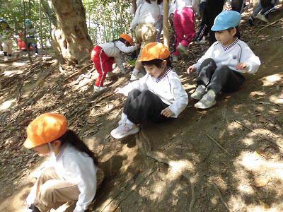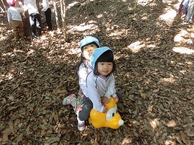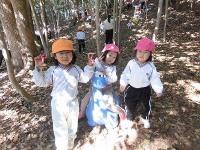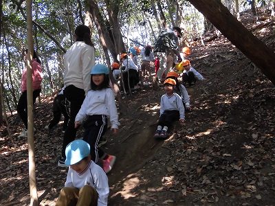 今日年中さんは冒険の森へ!斜面を滑ったり、走ったり、恐竜に乗ってみたり、葉っぱを集めたり…自然の中でのびのびと遊ぶ子どもたちです♪