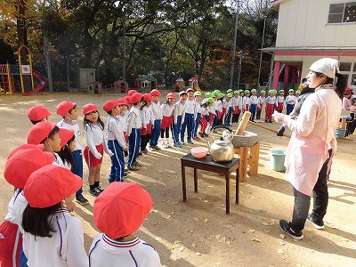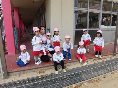 普段の避難訓練は全クラス園庭に集まるのですが、火災の発生場所によっては避難経路や避難場所が変わる可能性もあることを学ぶため、今日は園舎裏(お墓側)へ逃げるおけいこもしました。