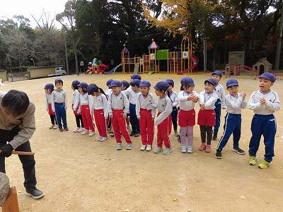 年少さんがチューリップの球根植えを行いました。まずは先生のお話を聞きます。