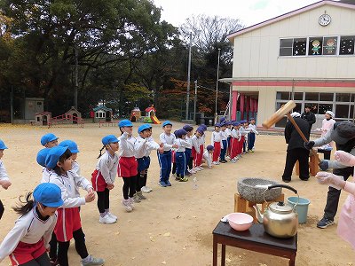 今日は子どもたちが楽しみにしていたおもちつき!朝から園庭に臼などが準備されているのを見てワクワクしていた子どもたちです。各クラスもちつきの順番が回ってくるとテンション高く園庭へ!
