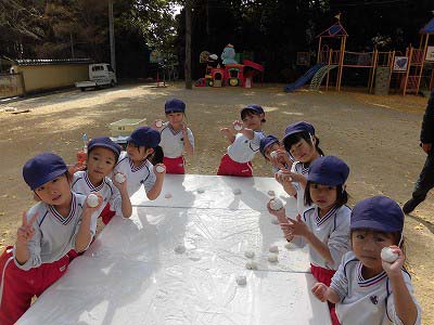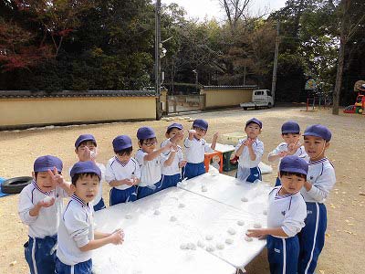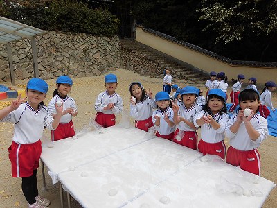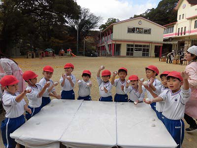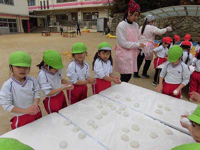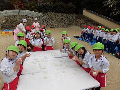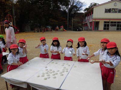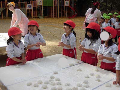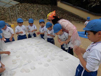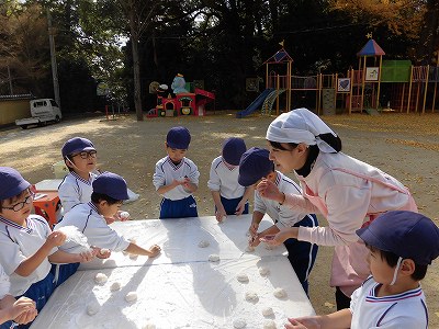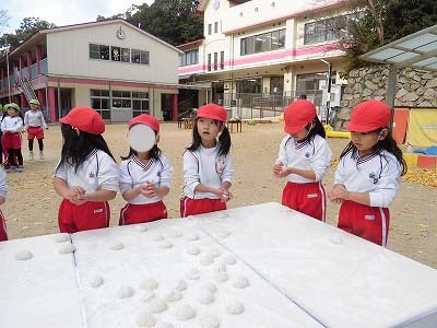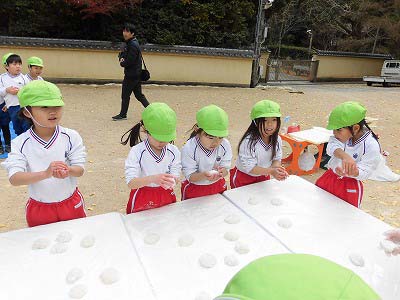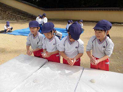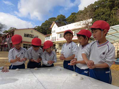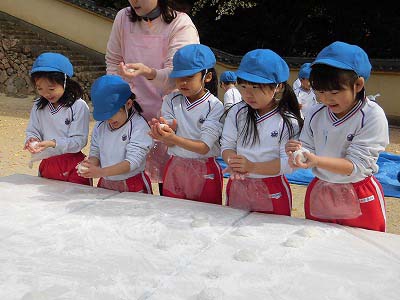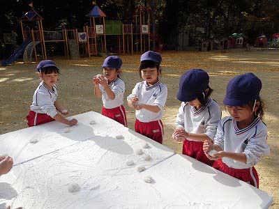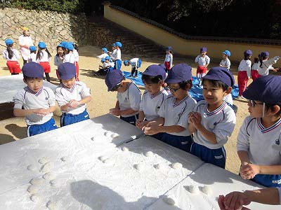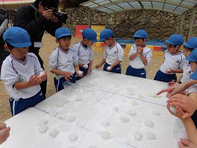 ここからは子どもたち自身が自分でお餅を丸めていきます。「俺、大きいのがいい!」とどのお餅が大きいかじっくりと選んでからおもちに手を伸ばす子どもたち(笑)選んだお餅を「ふわふわ~♡」と言いながら優しく丸めました。