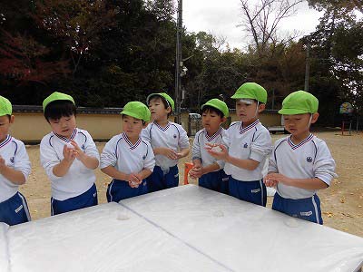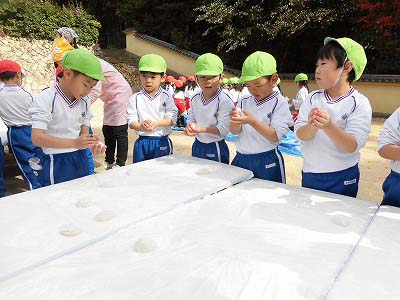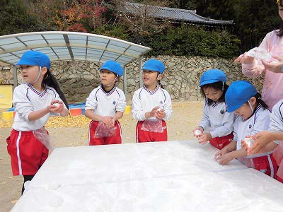 出来上がったお餅は先生たちがすばやく小分けに。みんなはこの間に手洗い・消毒を済ませました。