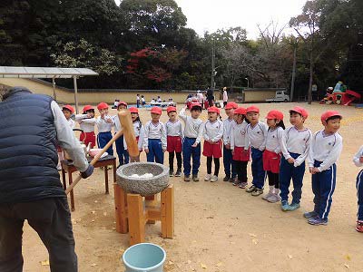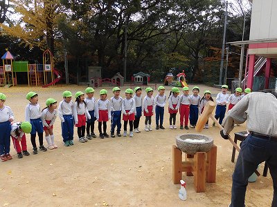 おまけ☆満3歳のお友だちはおもちをつく様子を見学しました。来年は一緒におもちつきに参加しようね♪