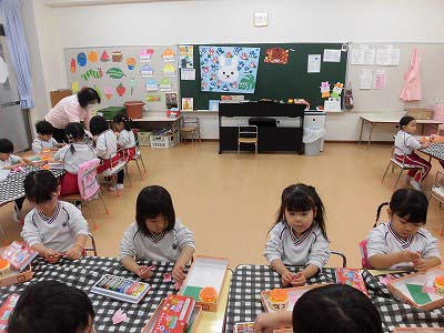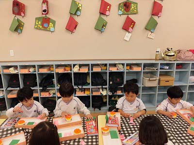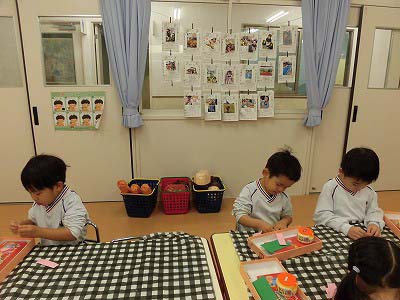 うさぎ組は来月のお店屋さんごっこに向けて「品物づくり」が始まりました。画用紙をウインナーやピーマンに見立てながら❝お料理❞の準備です♪