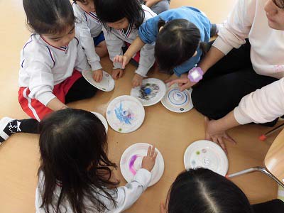 こあらさんは「コマづくり」をしました!お絵描きをして色を付けたコマを回すと「なんかきれい!」と子どもたち☆嬉しそうに何度もコマ回しを楽しんでいましたよ♪