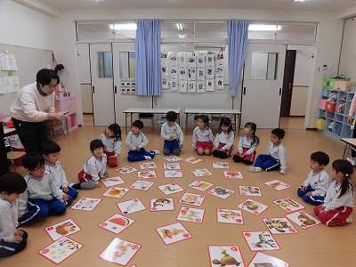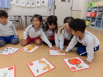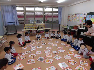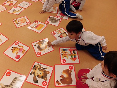 きりん組はお正月の遊び体験ということでみんなで大型カルタを楽しみました☆文字が読める子も読めない子も絵をヒントに一生懸命札を探していましたよ!