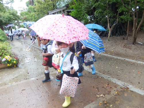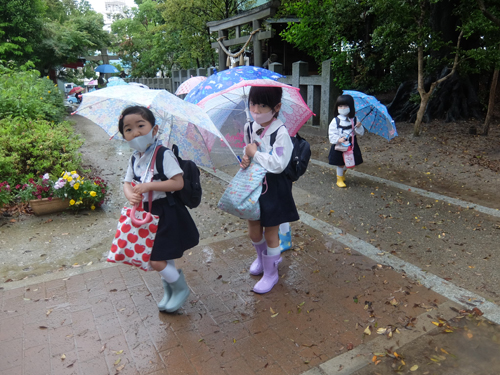 週明けの雨の日の朝ですが、子ども達は傘をさしながら元気に登園して来てくれました。