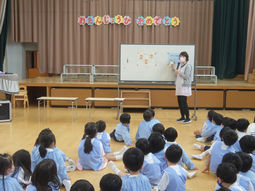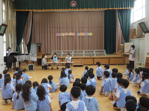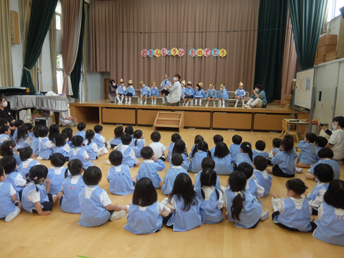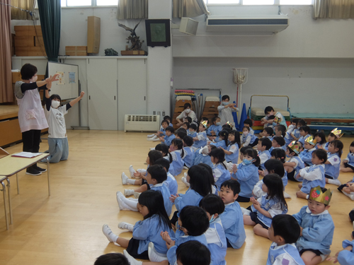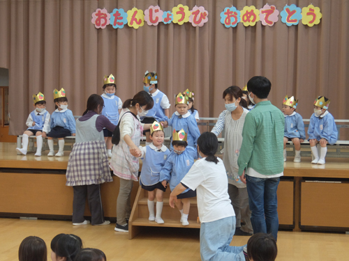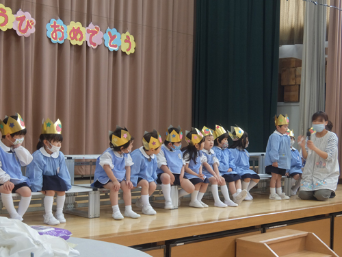続いて年少さんの誕生会です。年少さんは冠を被せてもらい、一人一人名前を呼んでもらうと「はい。」と返事をして、その都度拍手で祝ってもらいました。