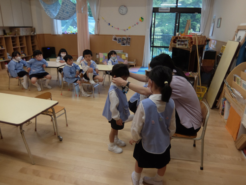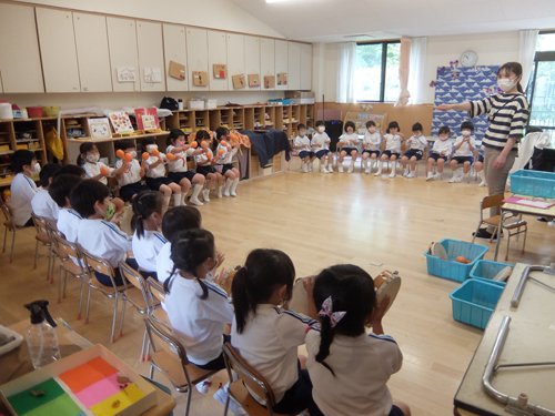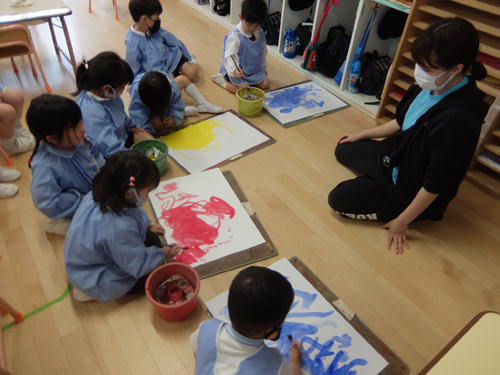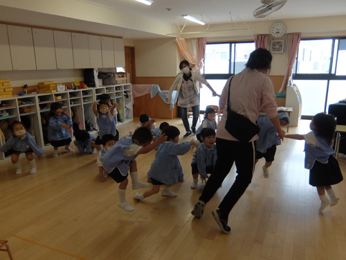 年少さんはお部屋でカエル等生き物の表現遊びをするクラスがありました。