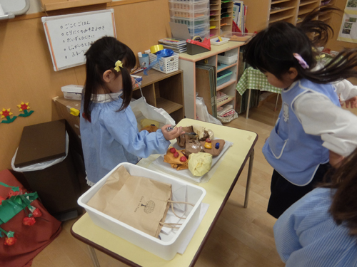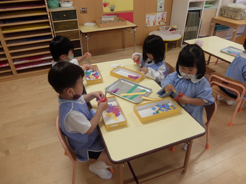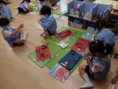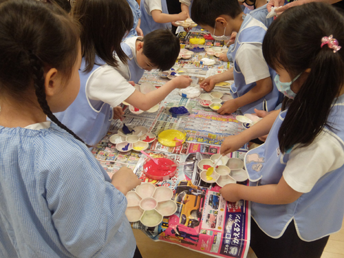 年長さんは紙粘土の制作に色塗りをしていますが、細部にもこだわって丁寧に色を塗っています。