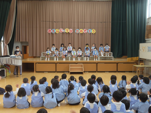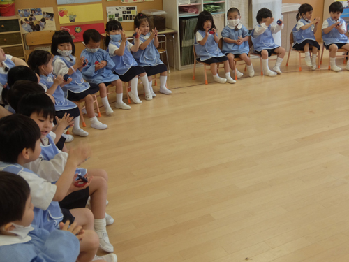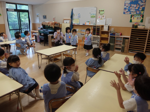 今は歌を歌うことを控えているので、年中さんも先生の伴奏に合わせて手拍子足拍子で遊んでいます。