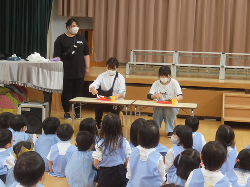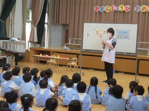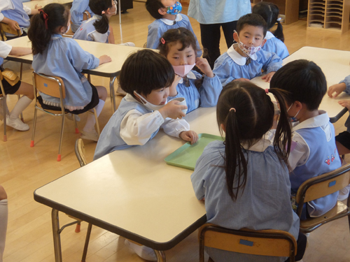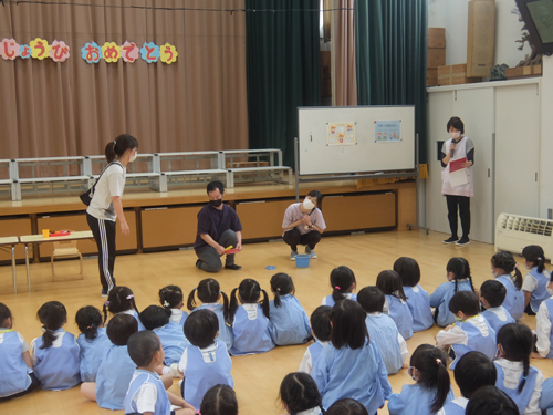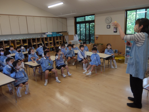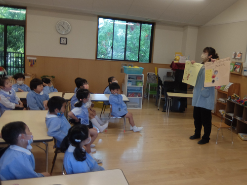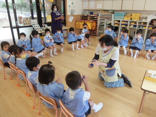 年中さんと同じように、寸劇と手洗いうがい指導を真剣な様子で観てくれていました。