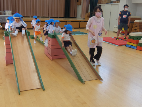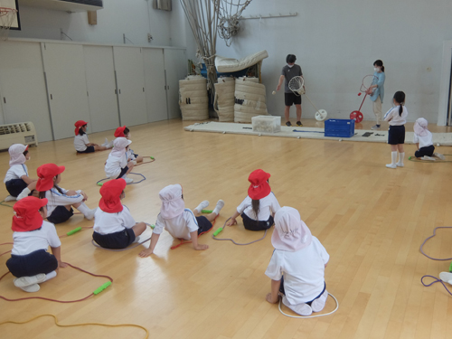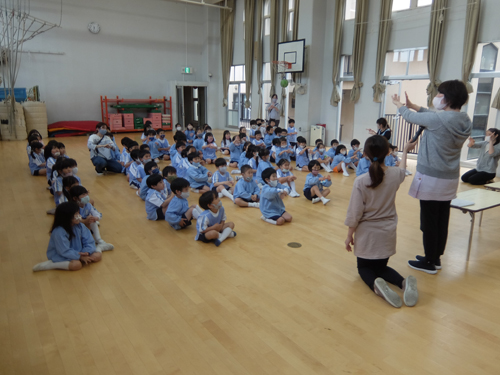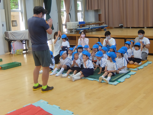 年中さんは運動講師の先生による体育遊びに参加しました。