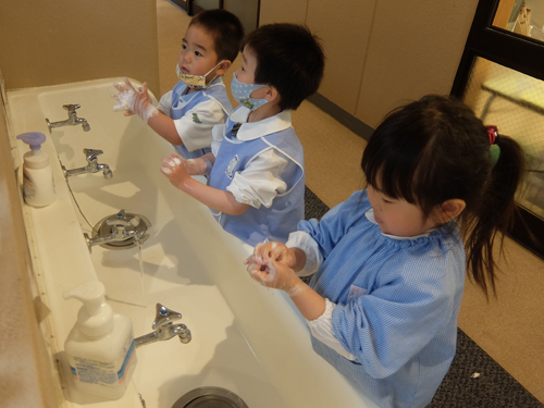 昨日、看護師さんから手洗いのやり方を教わり、早速、入念に手を洗う年少さんです。