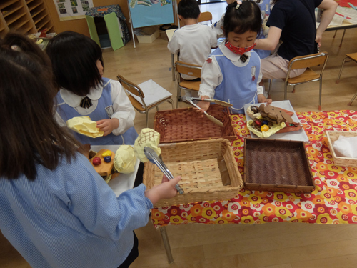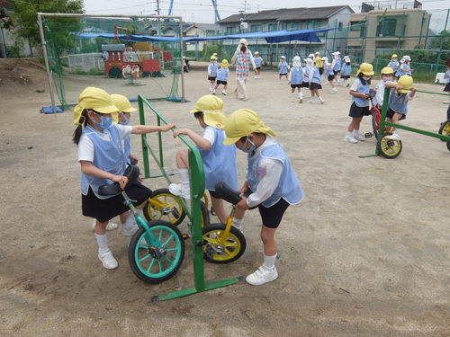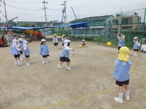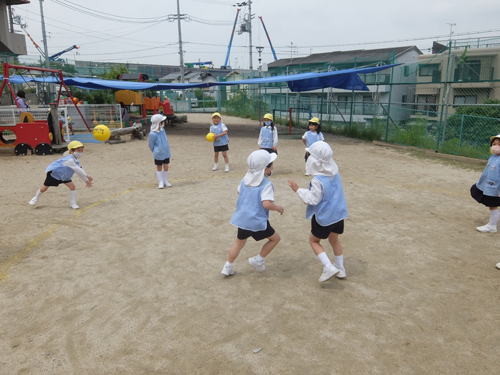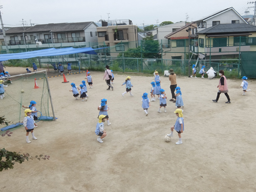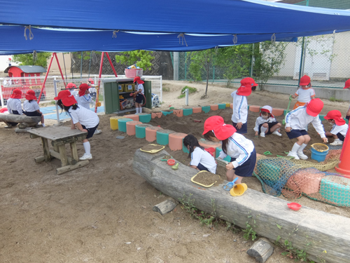 今日は幸い午前中は雨が降らず、年中さんは園庭でじっくり遊びました。