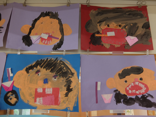 年中さんは、先日、自分の顔を描いていましたが、そこに貼り絵を加えて歯磨きをしている自分を表現しています。