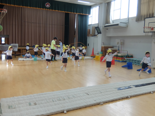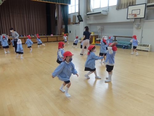 園庭には出られないので、体育館で鬼ごっこをする年中のクラスがありました。