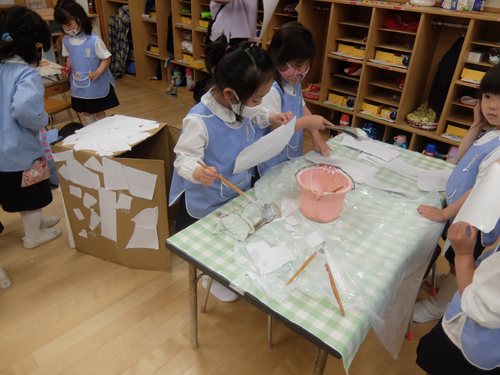 紙粘土を使った制作をしています。今日は水彩えのぐで色塗りをしました。