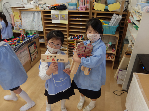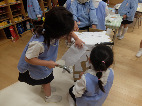 お部屋で必要なものを相談すると冷蔵庫ということになり、冷蔵庫をつくりっているクラスもありました。