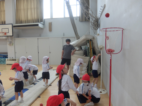 クラスごとに順番交代で体育館に行きます。運動講師の先生とご対面。