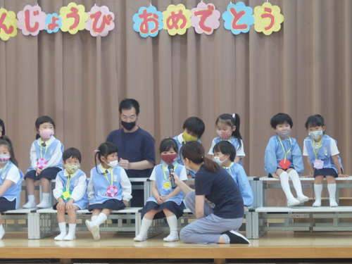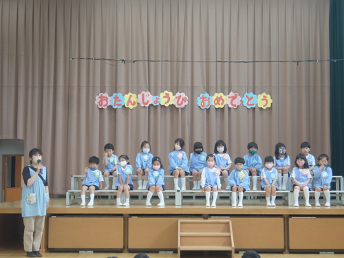 続いて年長さん。年長さんはクラスと名前と誕生日を自分で言って、一人一人みんなから祝ってもらいました。