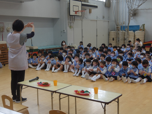 誕生会に続き、先生達が、砂場で遊んだ後、手を洗わずに給食を食べたらお腹が痛くなった寸劇を披露、