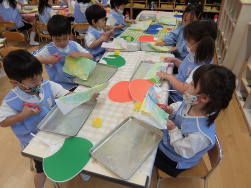 先週作ったにじみ絵のきれいな紙を切って、それを張り付けて、とても素敵なウチワを作っていました。