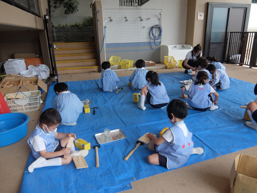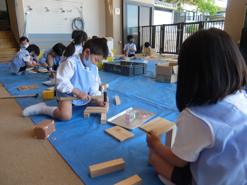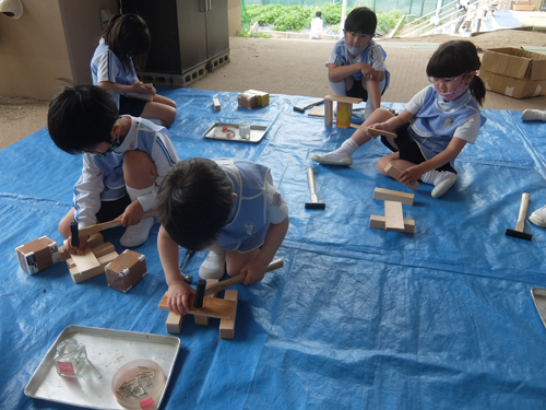 年長さんの木工遊びではどんどん釘打ちが上達しています。