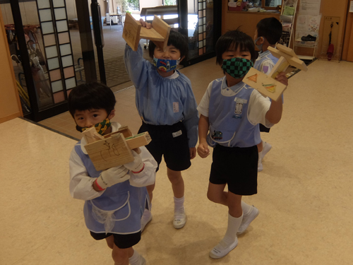 年長さんの木工遊びではどんどん釘打ちが上達して、看板や椅子を作る子も出てきました。