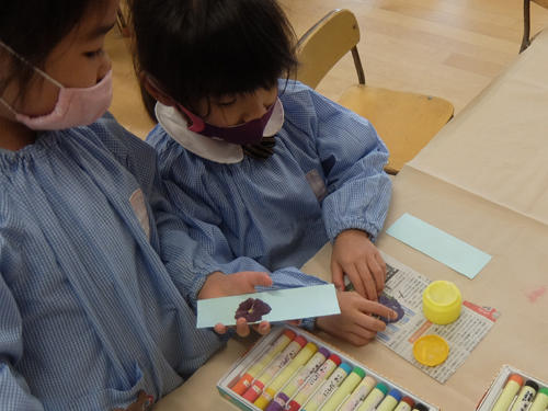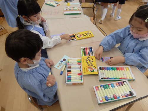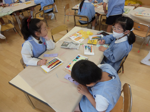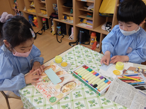 年長さんはしおりを作っていました。好きな模様や絵を描き、