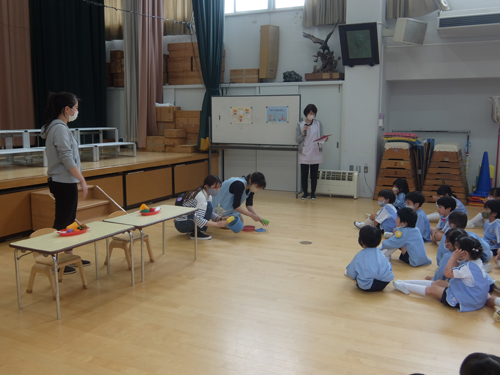 今日は年少さんが初めて運動講師の先生による体育遊びに参加しました。