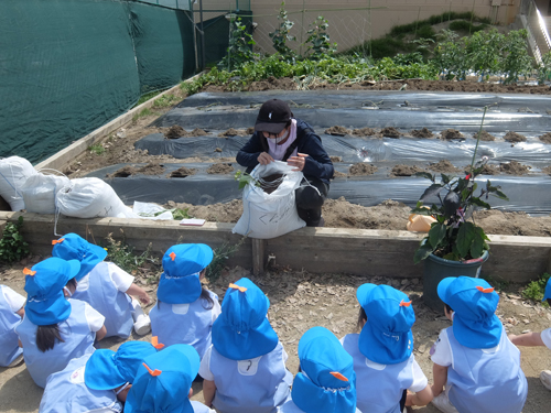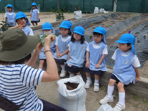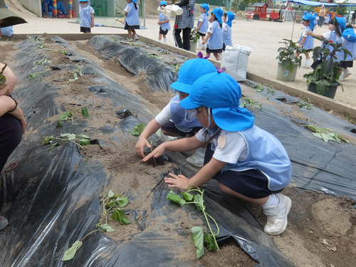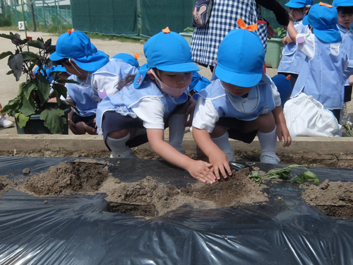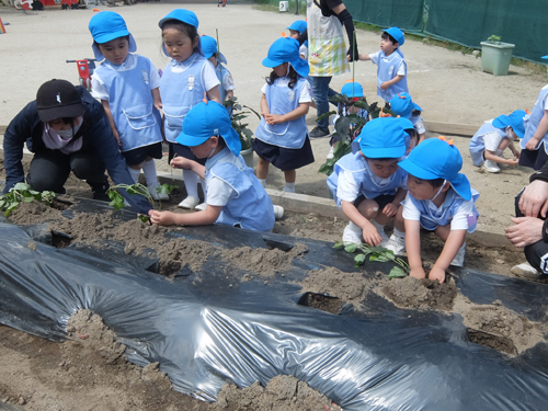 今日は年少さんが畑にイモの苗を植えました。
