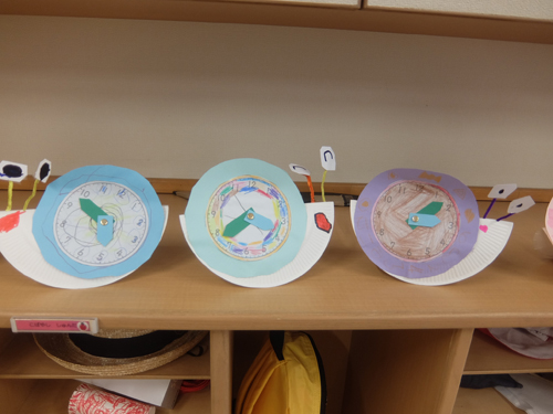カタツムリのかわいい時計ができました。針も動くので、この時計を使って遊べますね。