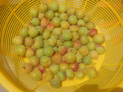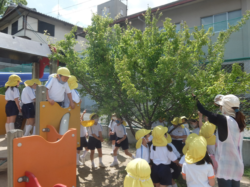 園庭の梅の木に梅を収穫に行くクラスがありました。