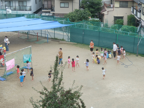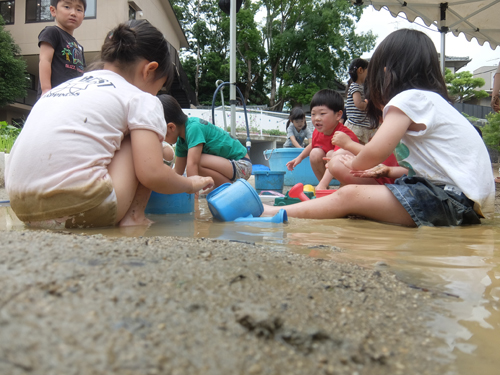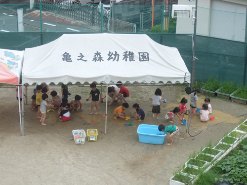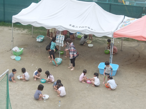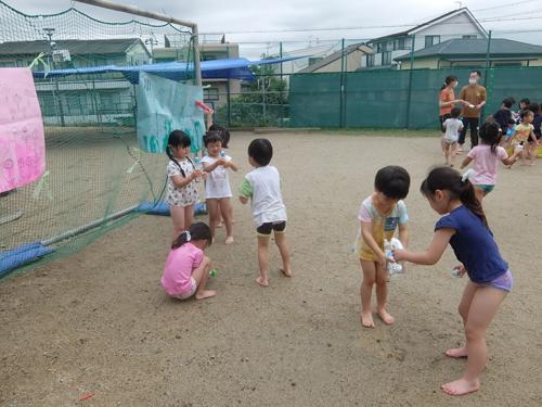 今日は午後からは雨降りでしたが、午前中は天気が安定していて、予定通り、プール遊びと水遊びを行うことができました。