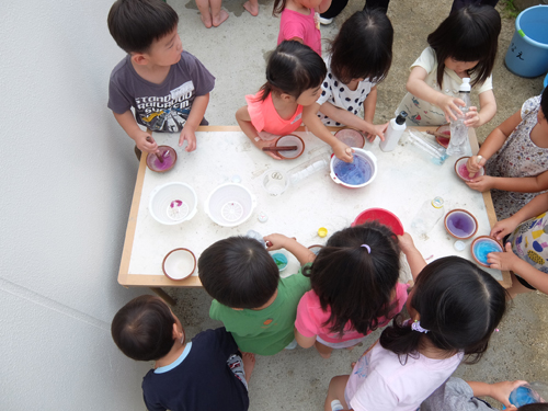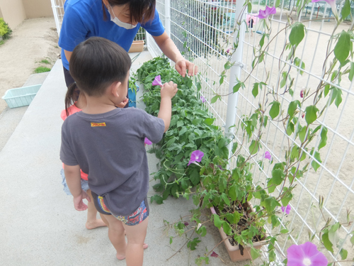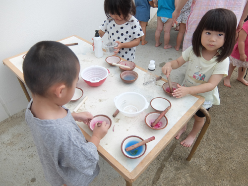 色水遊びでは色の粉のみでなく、朝顔を摘んで、磨り潰しての色水も作っていました。
