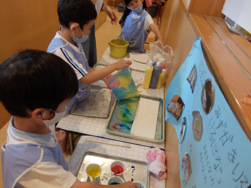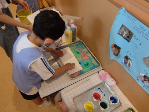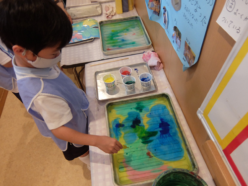 年長さんはマーブリングで綺麗な模様を作っていました。
