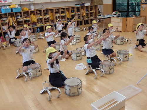秋の運動会に向けて、マーチングのドラム打ちもしていますよ。