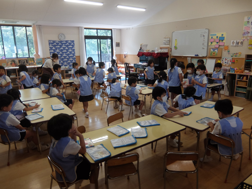 お帳面やお手紙袋を使うのも久しぶりです。今日は少し園生活を思い出してもらって、明日からはいよいよ二学期のスタートです。