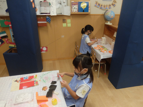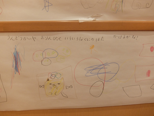 好きな国旗やオリンピックや運動会の絵を自由に描いています。