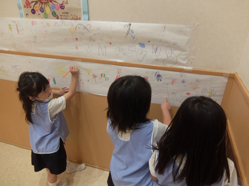 年中年長のお部屋に行く踊り場にはお絵かきコーナーがあります。