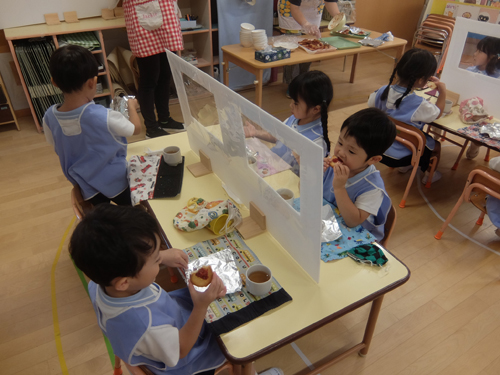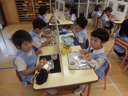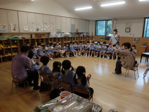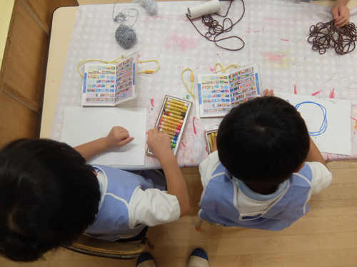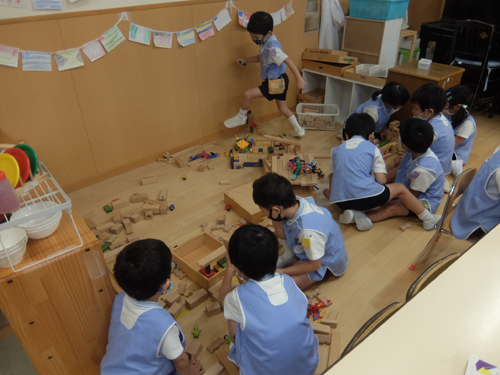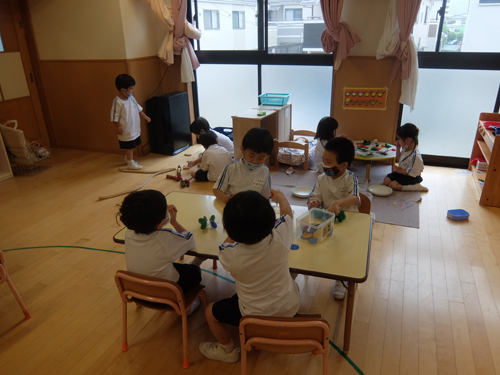 年少さんもお部屋でじっくりと遊びました。友達の輪も広がってきていますよ。