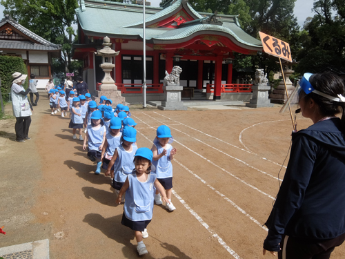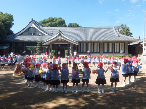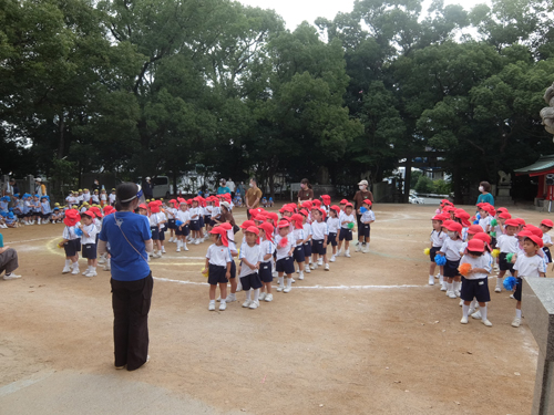 クラスごとの入場行進の後、開会式で神社参拝をして、園長先生の話を聴きました。